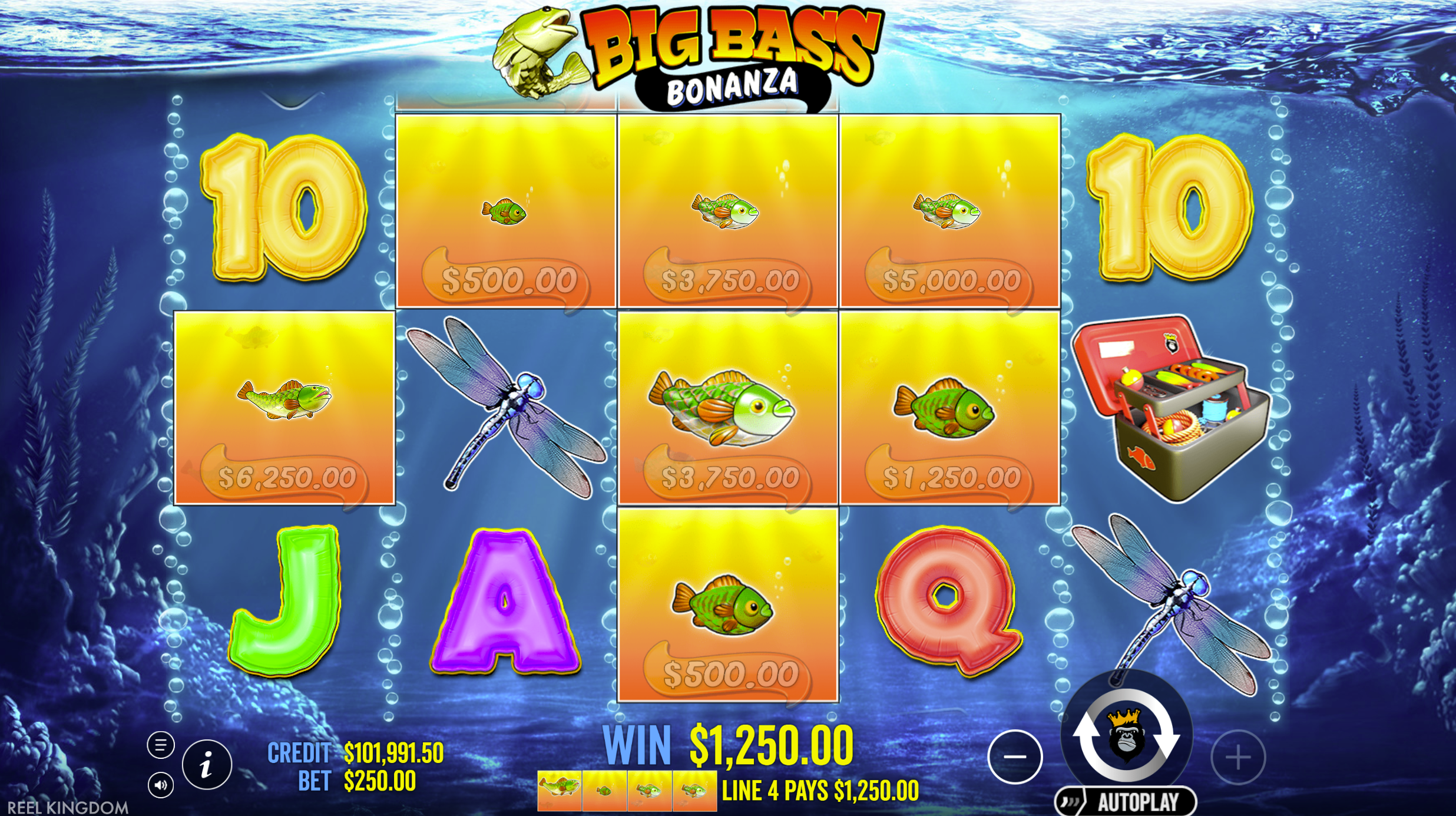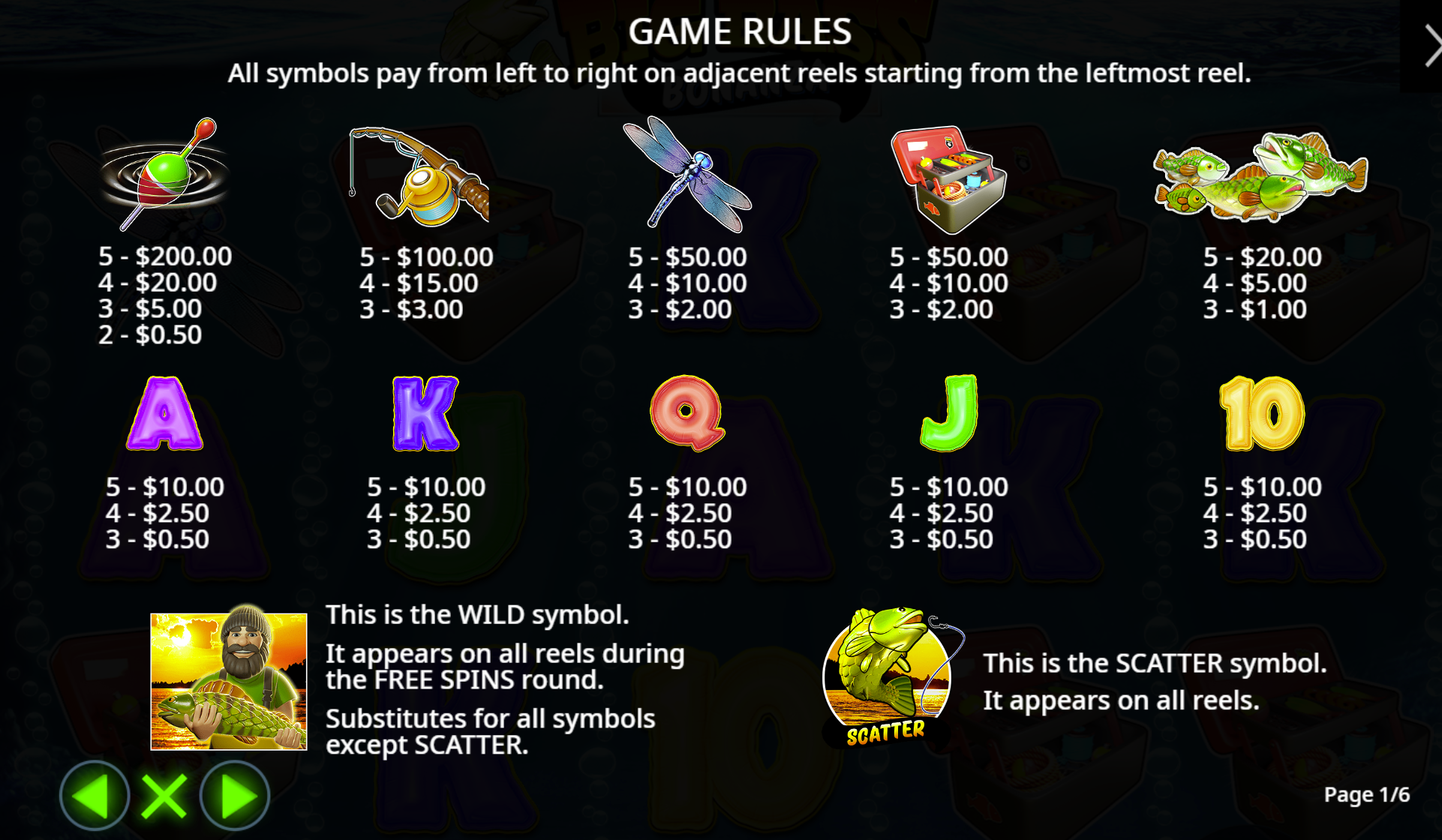 Base game spins follow a classic slot pattern: spin the reels, match symbols on a payline (left to right), and get wins. The low-value symbols are standard card royals, while higher-value icons include fish, tackle boxes, rods, floats, etc. :contentReference[oaicite:10]{index=10}